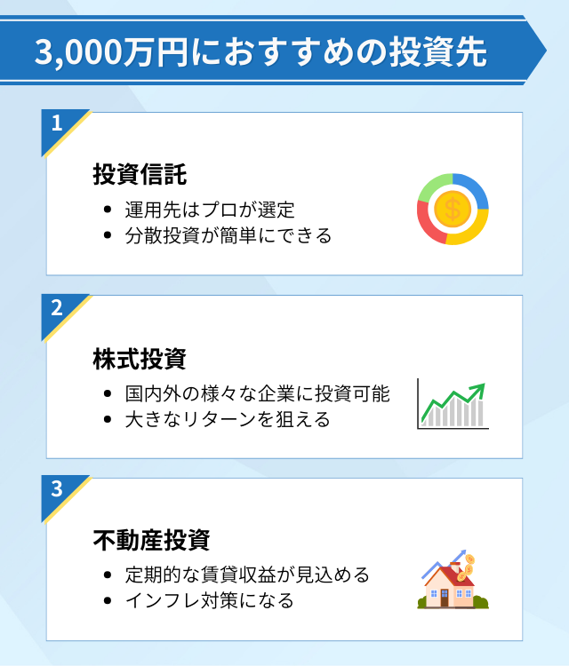 そこで、3,000万円の運用におすすめの3つの投資先を紹介する。