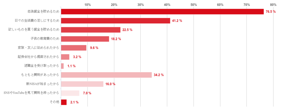 最も多いのは「老後資金を貯めるため」という回答で、76.5%にものぼる結果となった。