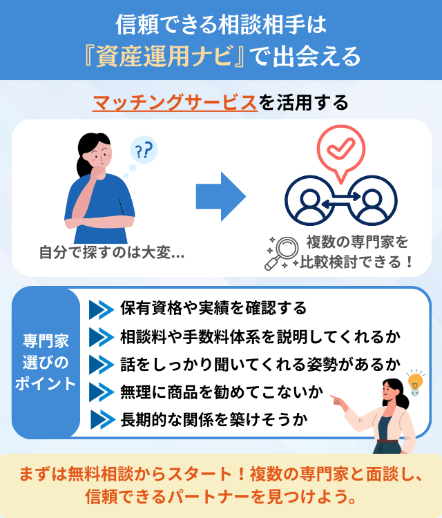 自分自身で投資が難しいと思う人は、資産運用アドバイザーなどの専門家に相談することをおすすめする。