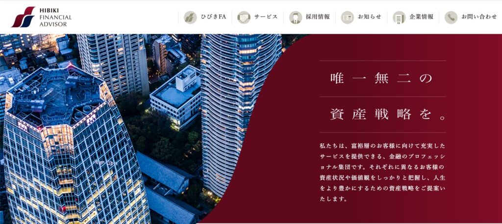 | ひびきフィナンシャルアドバイザー株式会社 | 楽天証券資本入り唯一のIFA 専門家ネットワーク+未上場ファンドなど独自商品あり 顧客数限定 | 高額資産を預ける富裕層 独自性の高い投資案件に興味がある人 |