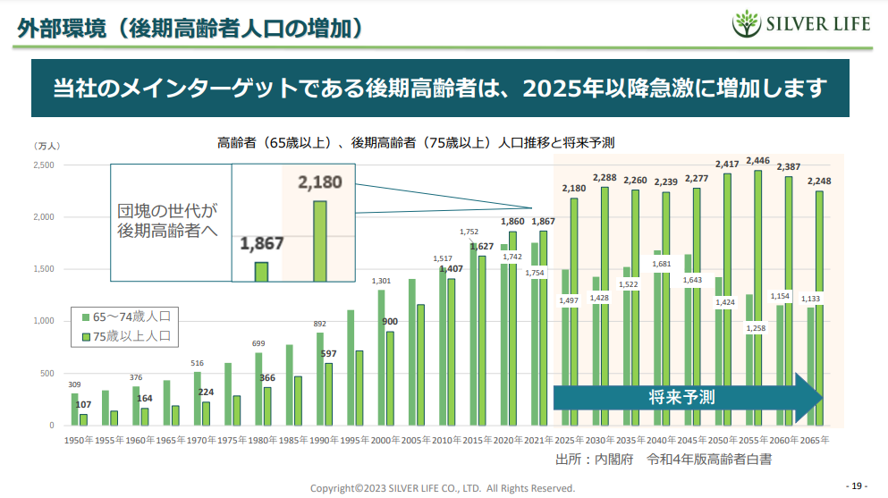 後期高齢者が増加する2025年を目安に社内インフラを整え、シェアNo.1を目指します。