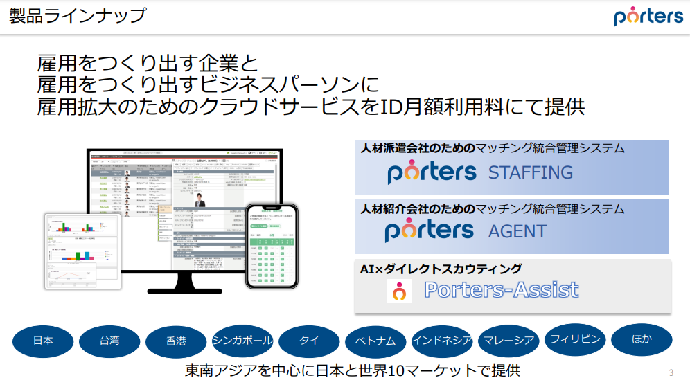 製品ラインナップは、人材派遣会社向けマッチング統合管理システム「PORTERS Staffing」、人材紹介会社向けのマッチング統合管理システム「PORTERS Agent」、AIによるダイレクトスカウティングサービス「PORTERS-Assist」の3つになります。