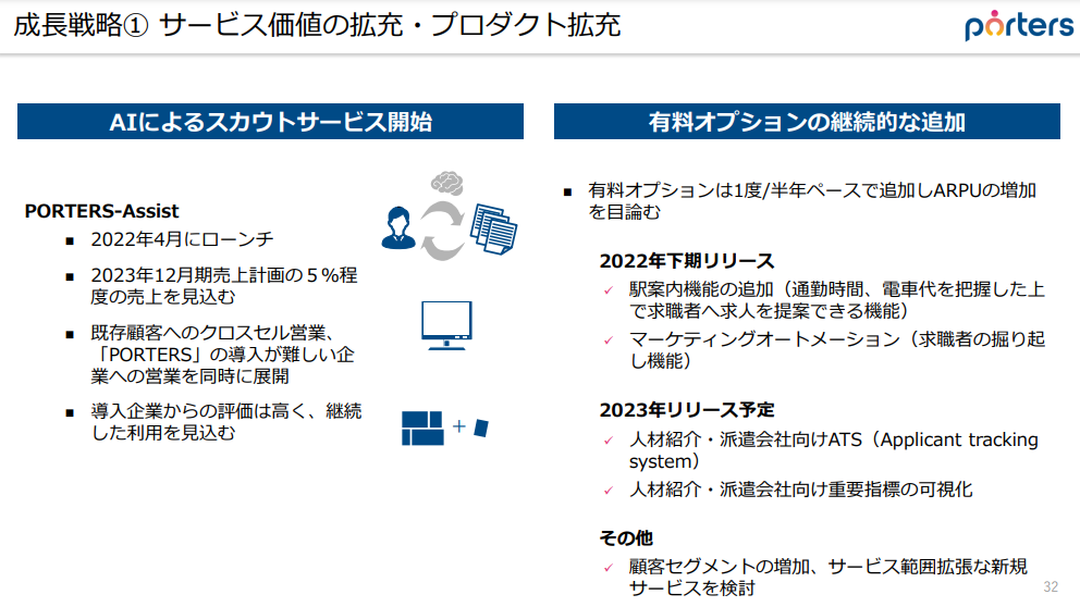 また、AIを用いたソリューション「PORTERS-Assist」を積極的に展開し、クロスセルでもAPRU向上を目指します。こちらは人材紹介の情報管理とはまた別の、求職者を獲得するダイレクトリクルーティングサービスとなっています。