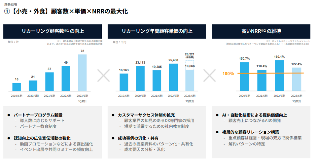まずは、既存の小売・流通および外食業界において顧客数×単価×NRRの最大化を目指します。