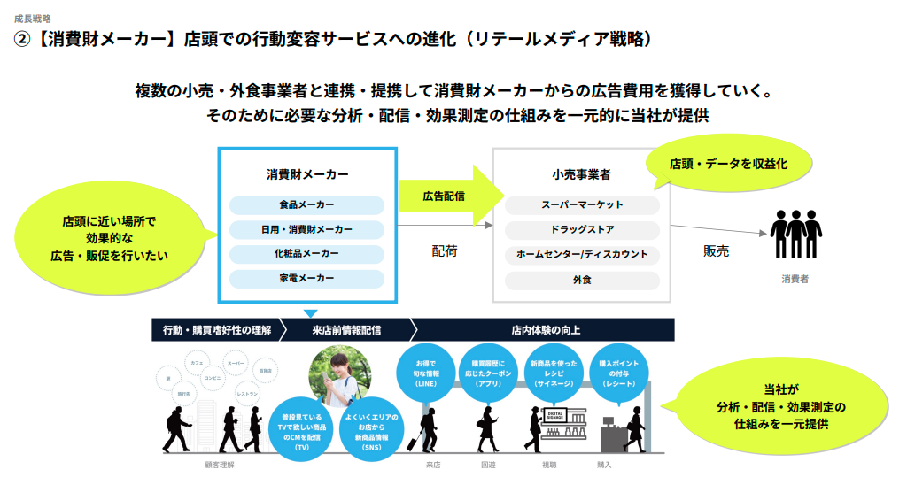 前提として、当社が提供する分析、広告、One to Oneソリューション事業を強化するほど、小売企業の店頭のデジタル化が進んでいく、という事実があります。