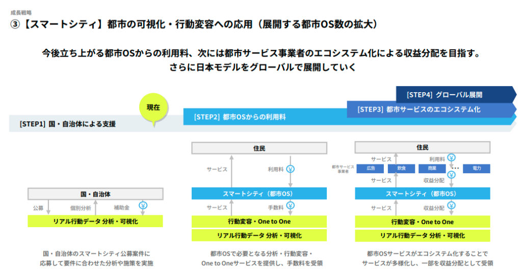 そして3つ目は、都市の可視化‧行動変容への応用を通じて日本・グローバルでスマートシティを推進していく戦略です。