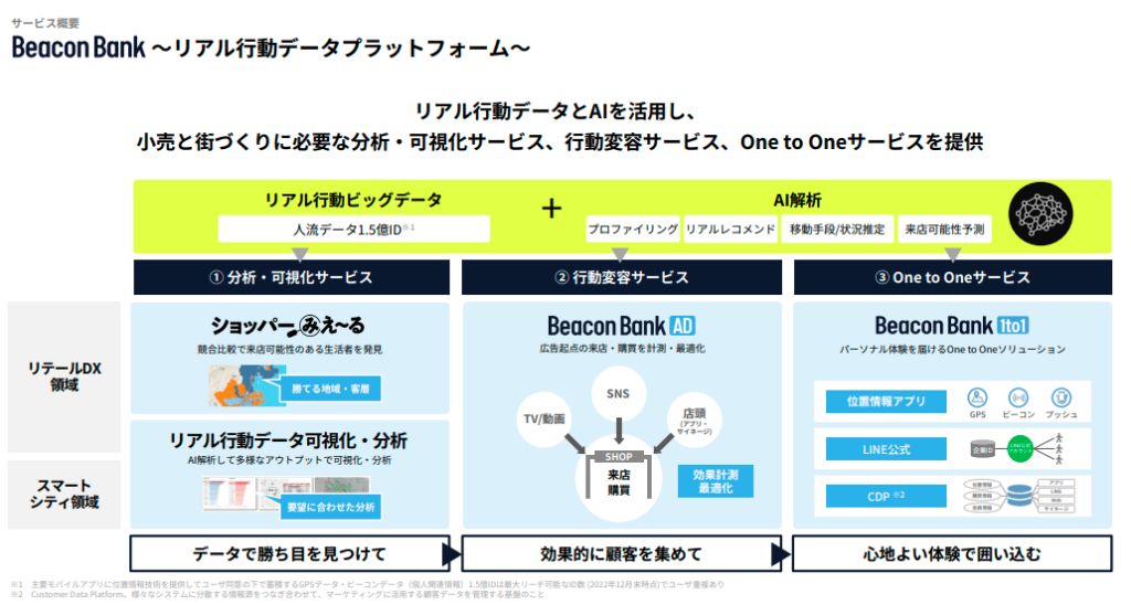 リアル行動データプラットフォーム「Beacon Bank」を運営するデータカンパニーです。