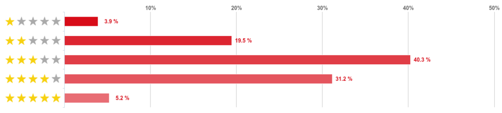 もっとも多かったのが「普通(星3つ)」の40.3%で、これは「良い(星4つ)」と「非常に良い(星5つ)」の合計36.4%を上回った。
